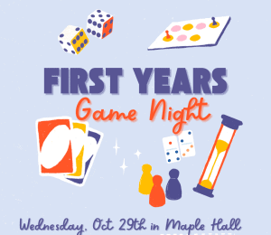 Calling all first-years! It’s game night. Join us in Maple Hall for a night of fun — from classic board games to group favorites and maybe a few surprises. We’ll have pizza and snacks, music, and plenty of chances to connect with friends.
