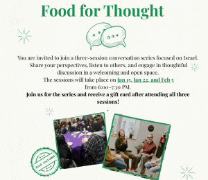 You are invited to join Dafna and Rabbi Lauren for a three-session conversation series focused on Israel and bringing together our UW Jewish community. Share your perspectives, listen to others, and engage in thoughtful discussion in a welcoming and open space.