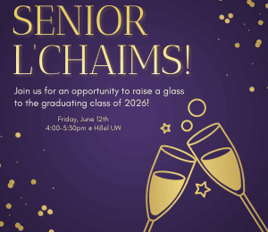 Seniors and friends and families of graduating seniors, join us for Senior L’Chaims, a special evening to celebrate the graduating class and the community that has shaped their college experience! We'll be schmoozing while enjoying heavy apps and celebratory drinks and reflecting on memories, friendships, and moments that made your time at Hillel and UW meaningful.